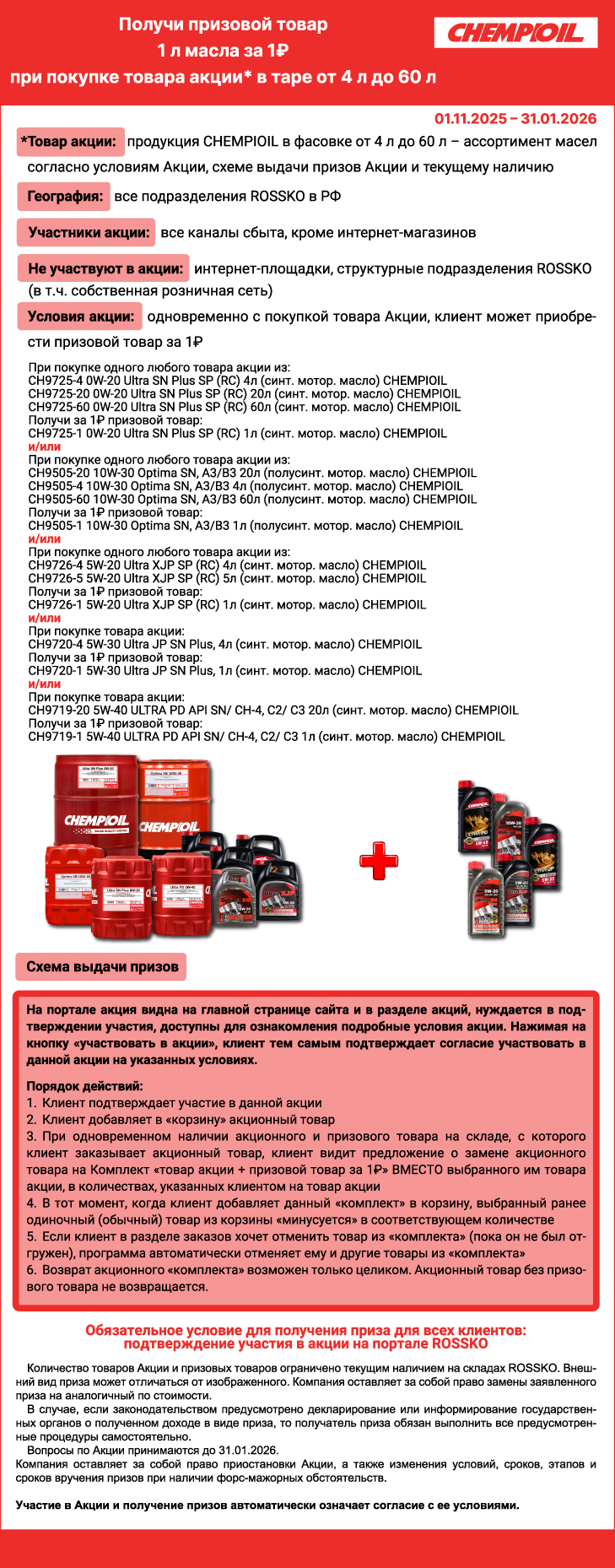 01.11.2025 – 31.01.2026 Акция «Получи призовой товар – 1л масла CHEMPIOIL за 1₽ – при покупке товара акции* в таре от 4 л до 60 л»